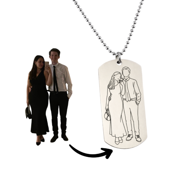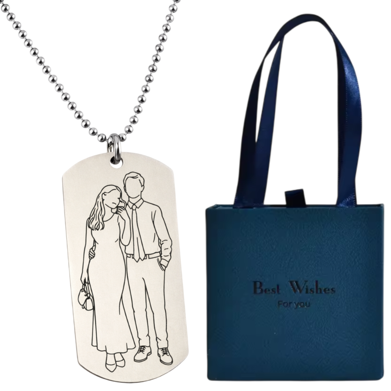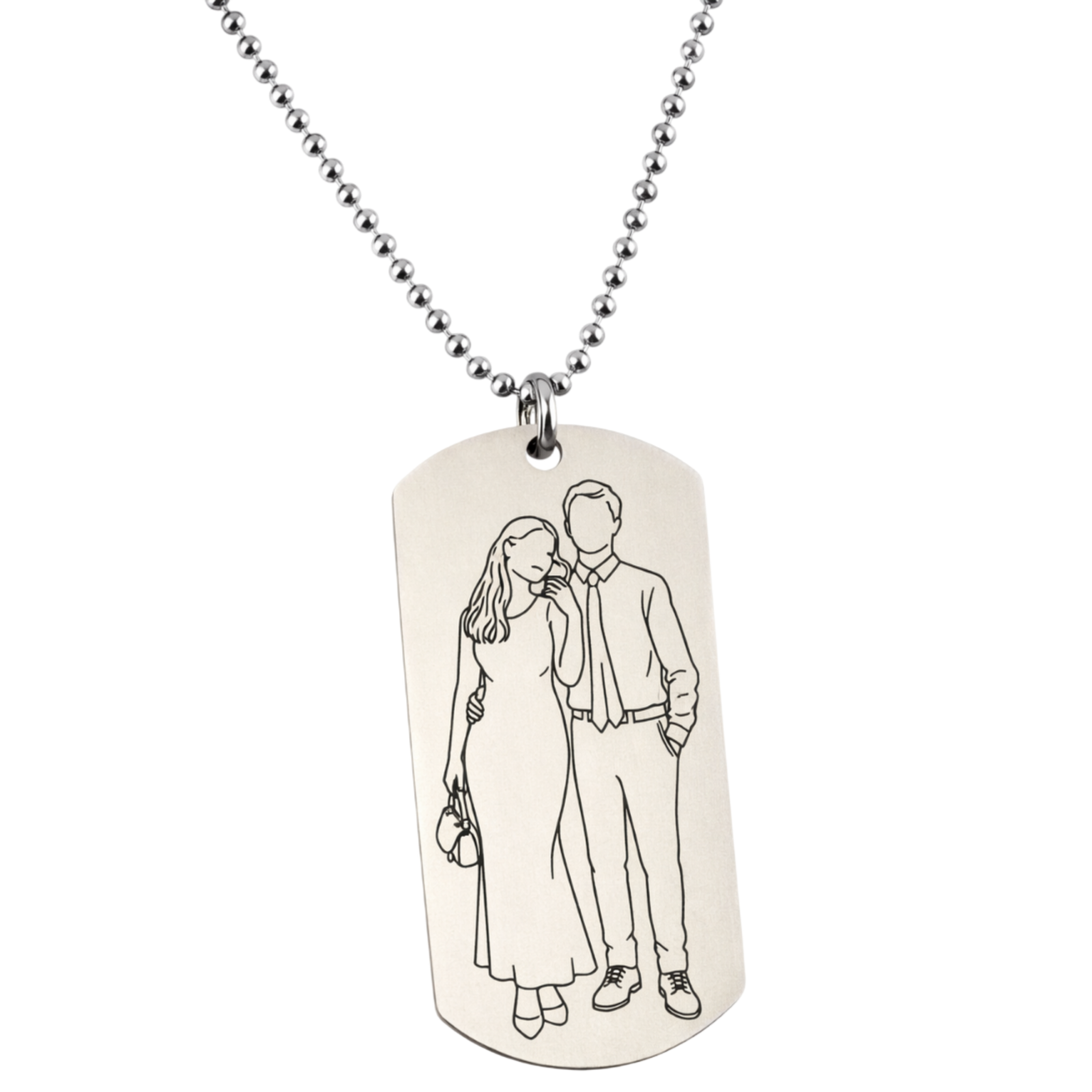 Personalizowany nieśmiertelnik z minimalistycznym grawerem line art to wyjątkowa pamiątka tworzona na podstawie Twojego zdjęcia. Wykonany ze stali nierdzewnej o wymiarach 5 × 3 cm, zawieszony na łańcuszku 70 cm, stanowi elegancki i trwały dodatek pełen emocji – idealny na prezent. ✨